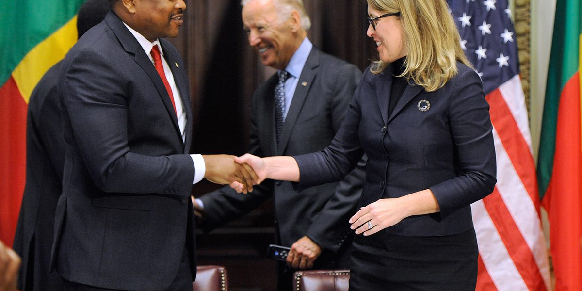 Benin Minister of Finance Komi Koutche and MCC CEO Dana J. Hyde sign the $375 million Benin Power Compact in the presence of Benin President Dr. Thomas Boni Yayi and U.S. Vice President Joe Biden on Wednesday, Sept. 9, 2015, in Washington.